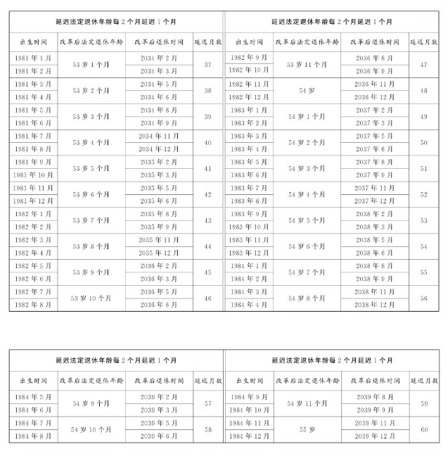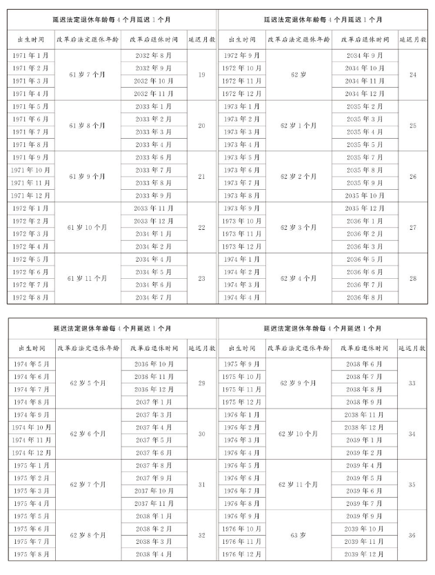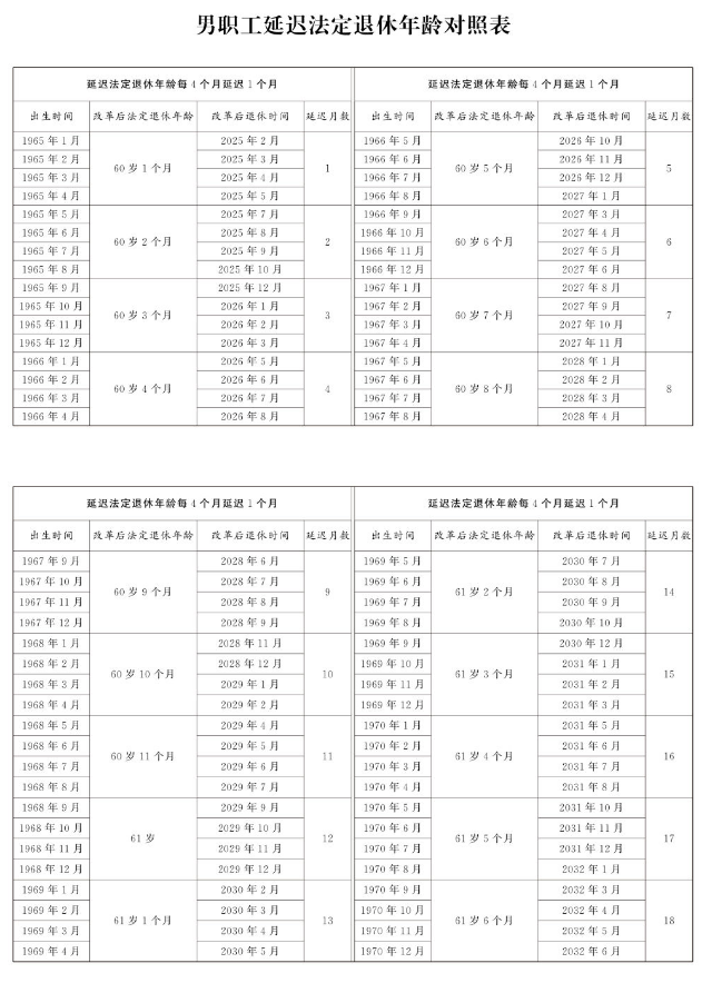 第一條?從2025年1月1日起,男職工和原法定退休年齡為五十五周歲的女職工,法定退休年齡每四個月延遲一個月,分別逐步延遲至六十三周歲和五十八周歲;原法定退休年齡為五十周歲的女職工,法定退休年齡每二個月延遲一個月,逐步延遲至五十五周歲。國家另有規定的,從其規定。