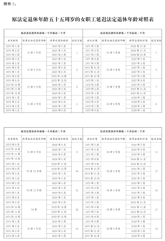 2.原法定退休年齡五十五周歲的女職工延遲法定退休年齡對照表