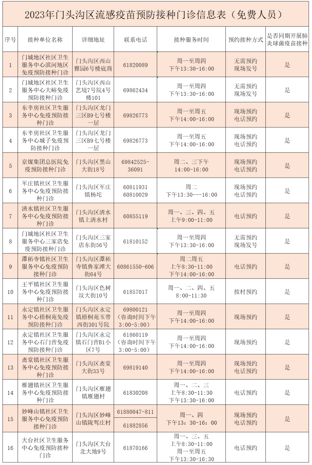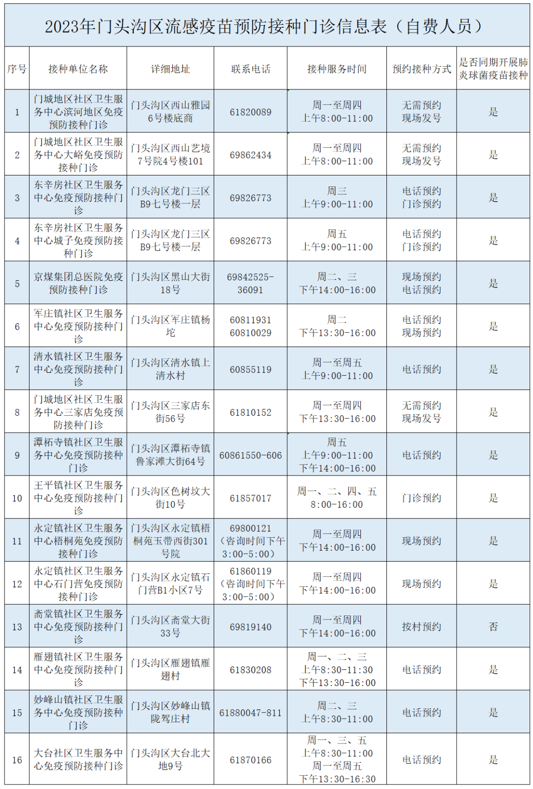 2023年流感疫苗預防接種工作即將開始,以下是門頭溝區免費流感疫苗和自費流感疫苗接種門診服務時間、咨詢電話及詳細地址。